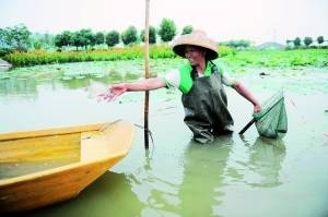 “幸運(yùn)的游客可以在游船時(shí)看到漁民捉魚的情景。”蓮花水鄉(xiāng)的工作人員告訴記者,現(xiàn)在景區(qū)共有10條疍家漁船,撐船者都是當(dāng)?shù)貪O民,閑暇時(shí)他們會(huì)在湖中捉魚,頗有江南魚米鄉(xiāng)之感。