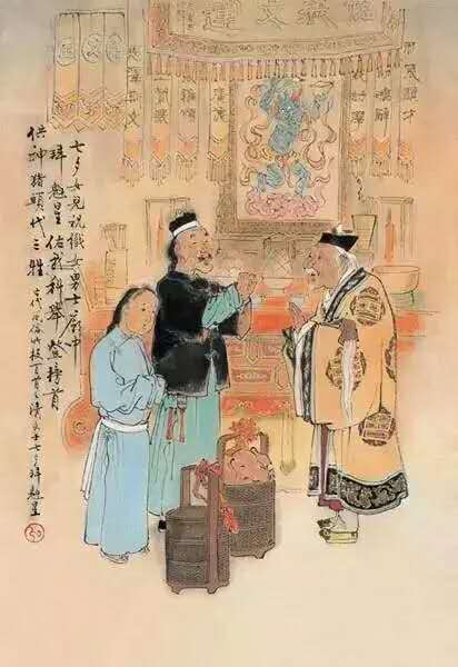 “拜織女”純是少女、少婦們的事。她們大都是預(yù)先和自己朋友或鄰里們約好五六人,多至十來人,聯(lián)合舉辦。舉行的儀式,是于月光下擺一張桌子,桌子上置茶、酒、水果、五子(桂圓、紅棗、榛子、花生,瓜子)等祭品;又有鮮花幾朵,束紅紙,插瓶子里,花前置一個小香爐。那么,約好參加拜織女的少婦、少女們,齋戒一天,沐浴停當(dāng),準(zhǔn)時都到主辦的家里來,于案前焚香禮拜后,大家一起圍坐在桌前,一面吃花生,瓜子,一面朝著織女星座,默念自己的心事。如少女們希望長得漂亮或嫁個如意郎、少婦們希望早生貴子等,都可以向織女星默禱。玩到半夜始散。